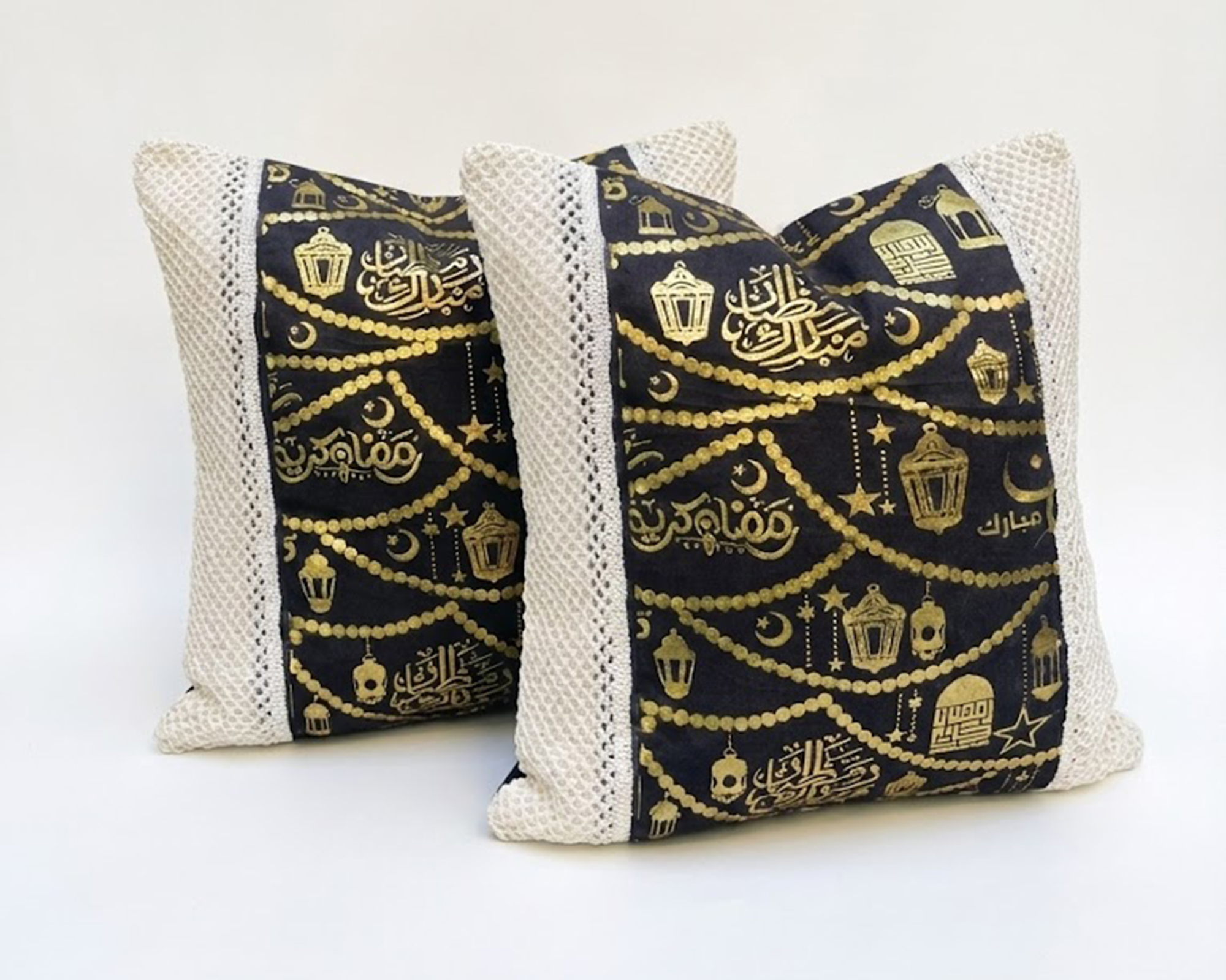 أضيفي لمسة فخامة وهدوء لطاولة السفرة أو الركنة مع طقم الرانر والكوشنز المميز بتطريز ذهبي راقٍ ينسجم مع أجواء رمضان والديكور العصري.