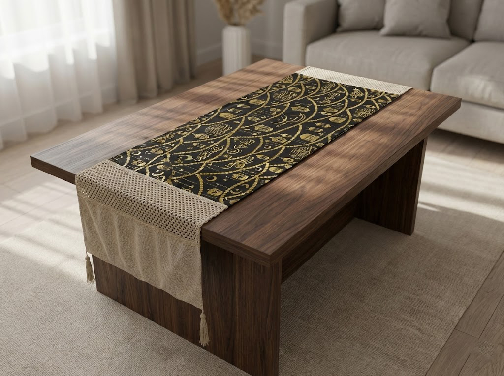 - رانر طاولة مع 2 كفر كوشن – بيج × أسود بتصميم رمضاني فاخر